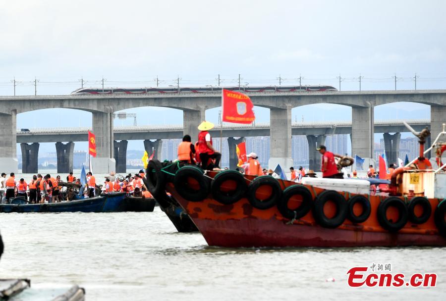 The people from both sides of the Taiwan Straits splash water on the sea to welcome the Dragon Boat Festival in Shishi, Quanzhou, Fujian province on the Dragon Boat Festival, June 10. (Photo: China News Service/ Lyu Ming)
