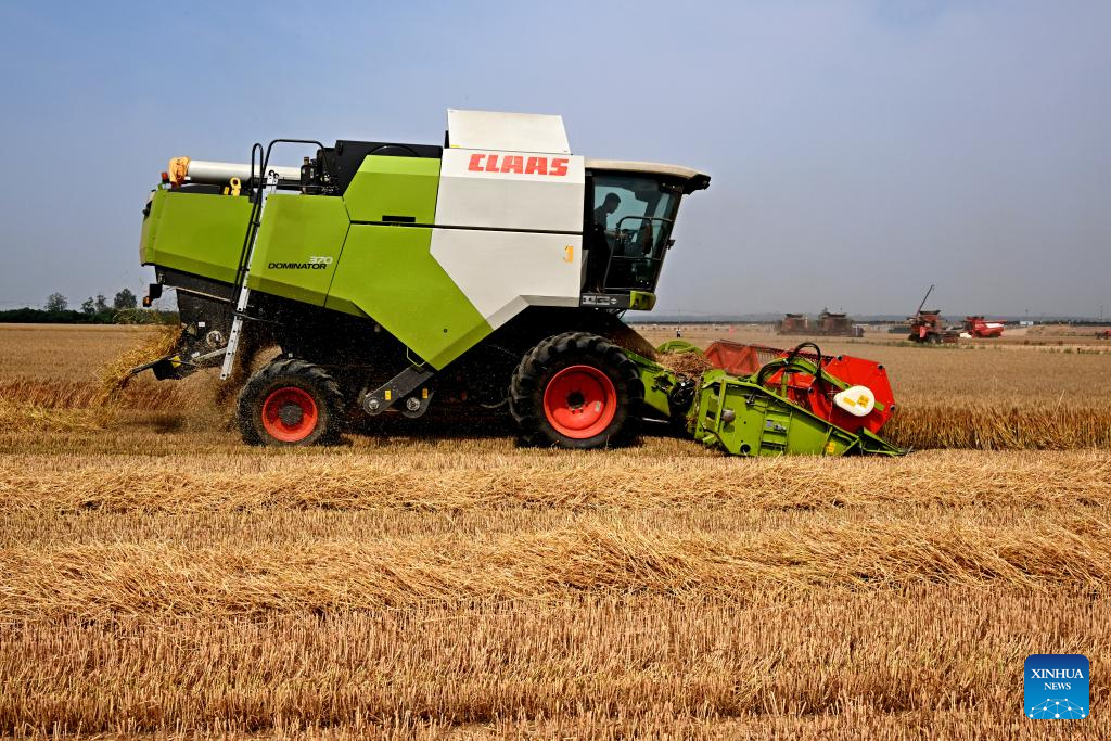A combine harvester works in a wheat field in Dachang Town of Xihai'an (West Coast) New Area in Qingdao, east China's Shandong Province, June 11, 2024. In east China's Shandong Province, China's second-largest wheat-producing area, a variety of loss-cutting activities have been carried out in each county and city with wheat plantation areas exceeding 4 million hectares. Meanwhile, more than 1.5 million sets of agricultural machinery are joining in the harvest in Shandong. (Xinhua/Li Ziheng)