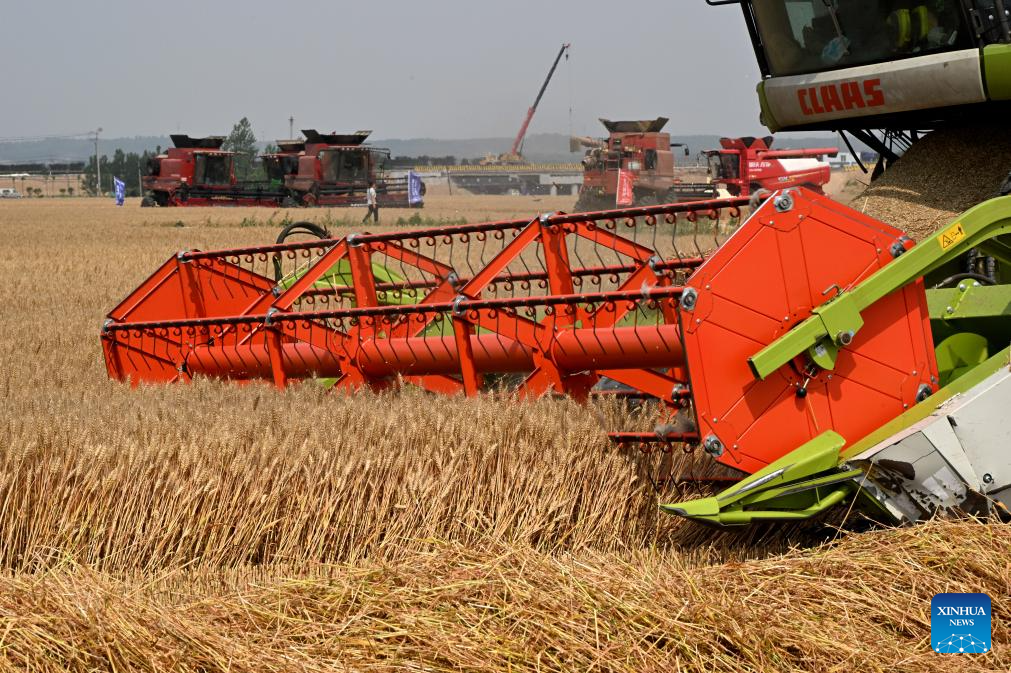 Combine harvesters reap wheat in a field in Dachang Town of Xihai'an (West Coast) New Area in Qingdao, east China's Shandong Province, June 11, 2024. In east China's Shandong Province, China's second-largest wheat-producing area, a variety of loss-cutting activities have been carried out in each county and city with wheat plantation areas exceeding 4 million hectares. Meanwhile, more than 1.5 million sets of agricultural machinery are joining in the harvest in Shandong. (Xinhua/Li Ziheng)