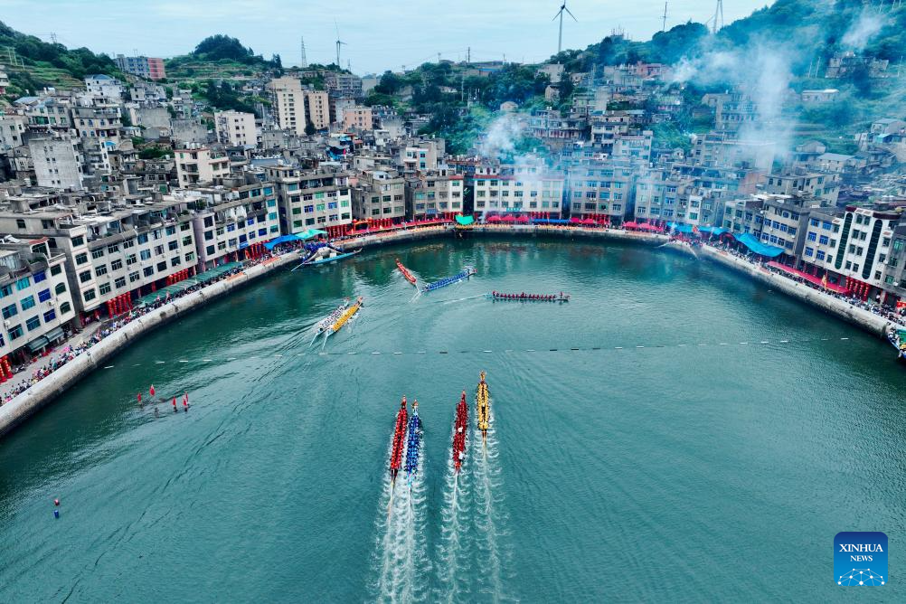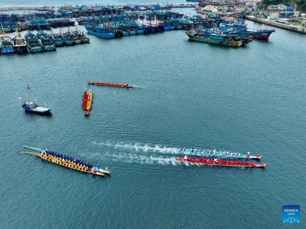 An aerial drone photo shows contestants participating in a dragon boat race at a fishing port in Lianjiang County, southeast China's Fujian Province, June 11, 2024. The dragon boat race at sea has a long history in Lianjiang. The eight-day event from the first day of the fifth month of the Chinese lunar calendar has become a well-known cultural activity to celebrate the Dragon Boat Festival, also called Duanwu Festival. (Xinhua/Jiang Kehong)