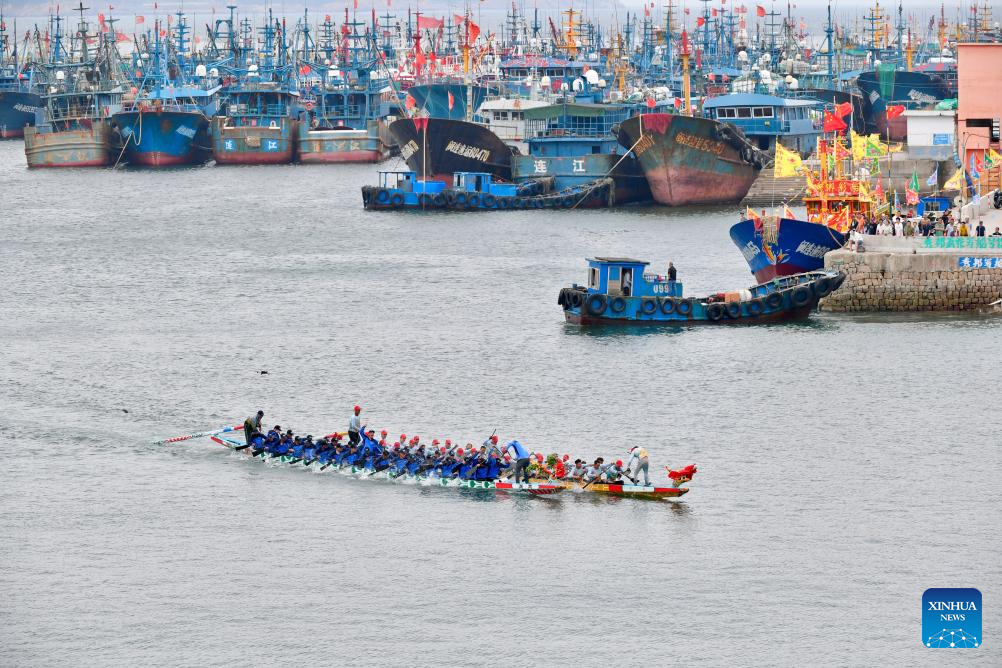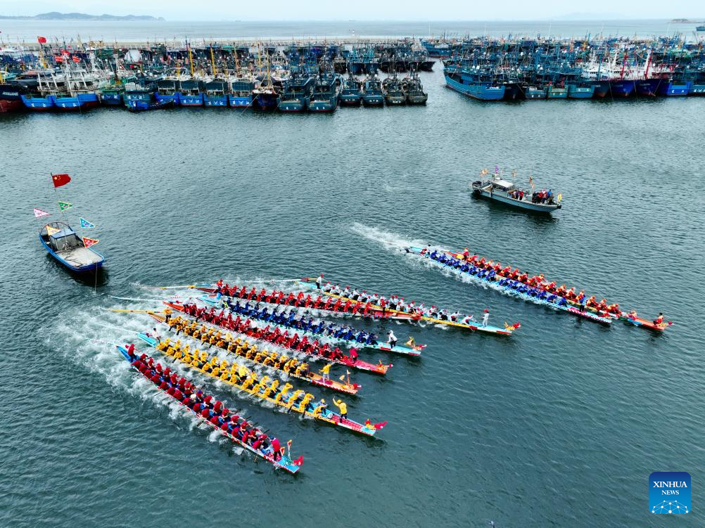 Contestants participate in a dragon boat race at a fishing port in Lianjiang County, southeast China's Fujian Province, June 11, 2024. The dragon boat race at sea has a long history in Lianjiang. The eight-day event from the first day of the fifth month of the Chinese lunar calendar has become a well-known cultural activity to celebrate the Dragon Boat Festival, also called Duanwu Festival. (Xinhua/Jiang Kehong)