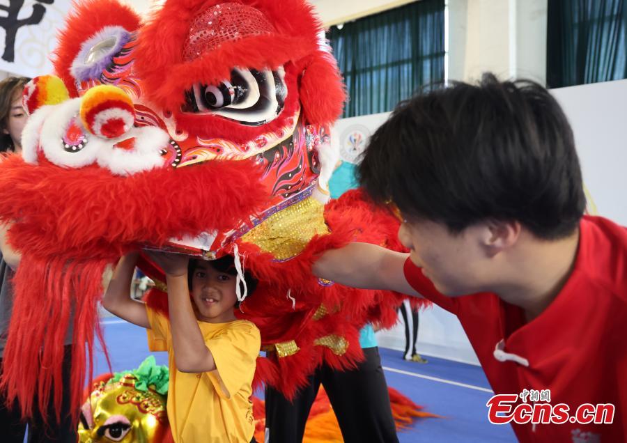 The delegation watches a lion dance performance by university students. (Photo: China News Service/ Yang Kejia)