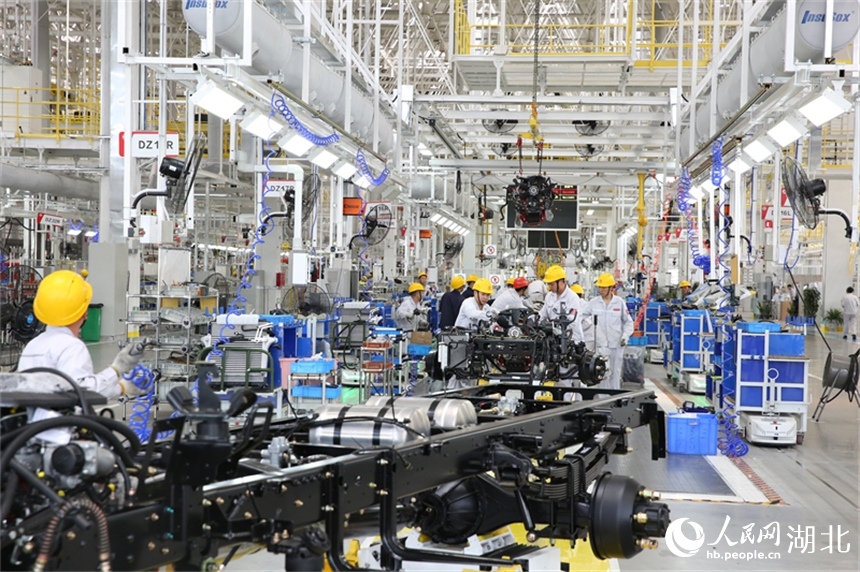 Automatic guided vehicles (AGVs) navigate through the 30,000-square-meter workshop to assist workers in assembling light trucks at Dongfeng Motor Corporation's smart manufacturing and green factory in Xiangyang, central China's Hubei Province. (People's Daily Online/Wang Guoji)