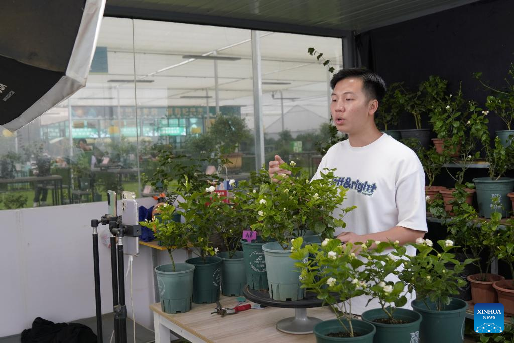 Mo Dianjin sells jasmine potted plants via livestream at a jasmine planting base in Hengzhou, south China's Guangxi Zhuang Autonomous Region, May 10, 2024. (Xinhua/Zhao Huan)