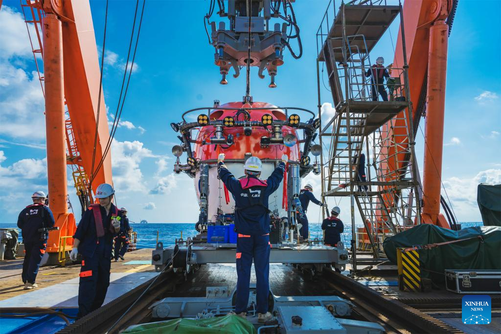This undated file photo shows the manned submersible Shenhai Yongshi (Deep Sea Warrior) conducting a dive for deep-sea archaeological investigation. More than 900 pieces of cultural relics have been retrieved from two ancient shipwrecks discovered in the South China Sea, the National Cultural Heritage Administration (NCHA) said Thursday. (NCHA/Handout via Xinhua)