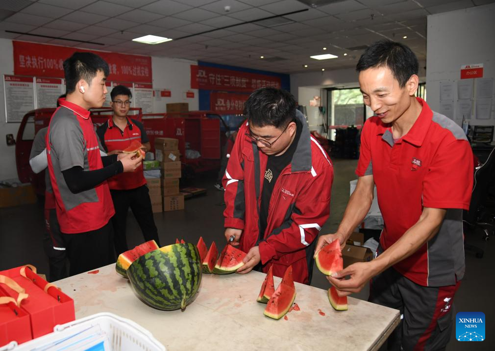 Deliverymen eat pieces of watermelon at a delivery site in Beilin District of Xi'an, northwest China's Shaanxi Province, June 13, 2024. During the hot summer days, local organizations in Xi'an have sent watermelons, bottled water, and other cooling supplies to outdoor workers. (Xinhua/Zhang Bowen)