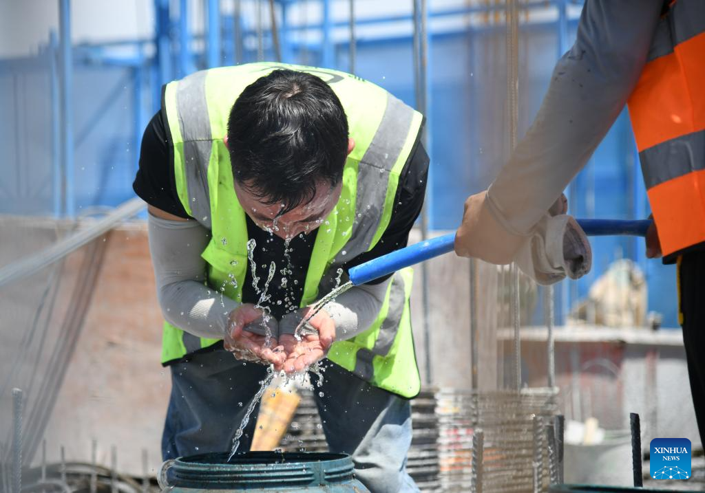 An outdoor worker washes his face at a construction site in Xi'an, northwest China's Shaanxi Province, June 13, 2024. During the hot summer days, local organizations in Xi'an have sent watermelons, bottled water, and other cooling supplies to outdoor workers. (Xinhua/Zhang Bowen)