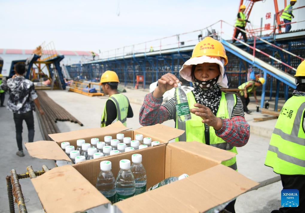 An outdoor worker takes a bottle of water at a construction site in Baqiao District of Xi'an, northwest China's Shaanxi Province, June 12, 2024. During the hot summer days, local organizations in Xi'an have sent watermelons, bottled water, and other cooling supplies to outdoor workers. (Xinhua/Zhang Bowen)