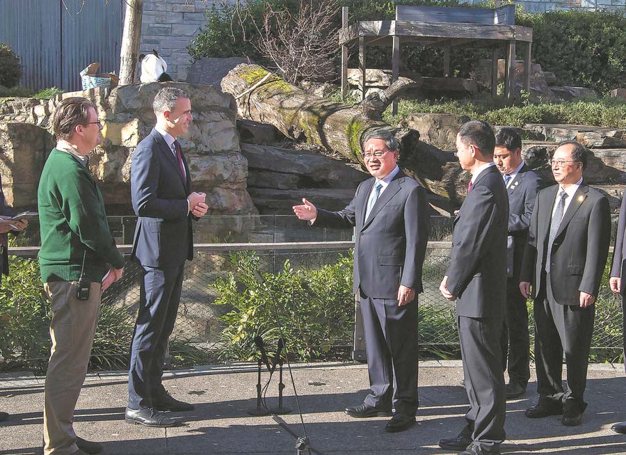 Premier Li Qiang inspects the panda enclosure at Adelaide Zoo on Sunday during his visit to Australia. Adelaide Zoo is the only Australian zoo that has giant pandas for China-Australia cooperation on panda protection and research. LI TAO / XINHUA
