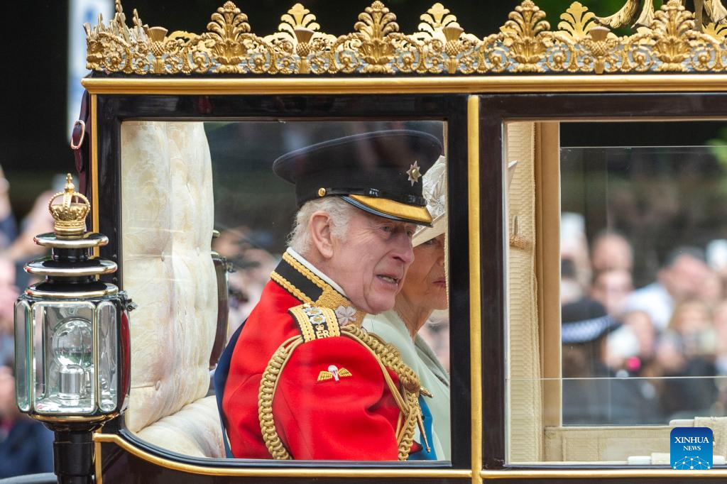 Britain's King Charles III and Queen Camilla ride a royal carriage during the Trooping the Colour parade to honour him on his official birthday in London, Britain, on June 15, 2024. (Photo by Stephen Chung/Xinhua)