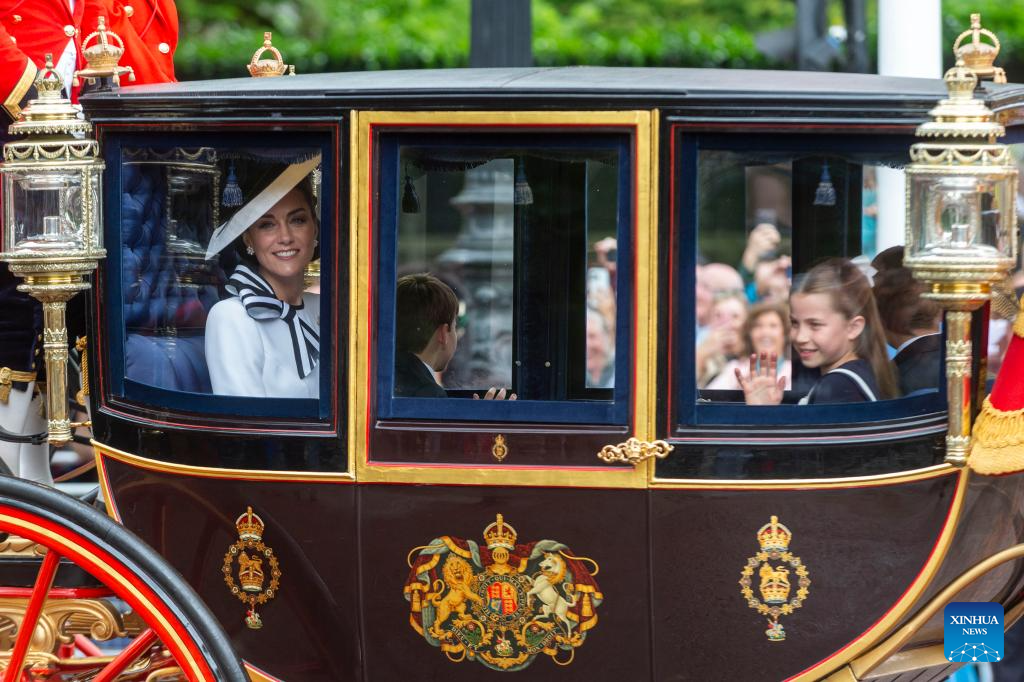 Britain's Catherine (L), Princess of Wales, rides a royal carriage with Princess Charlotte, Prince George and Prince Louis, during the Trooping the Colour parade to honour Britain's King Charles III on his official birthday in London, Britain, on June 15, 2024. (Photo by Stephen Chung/Xinhua)