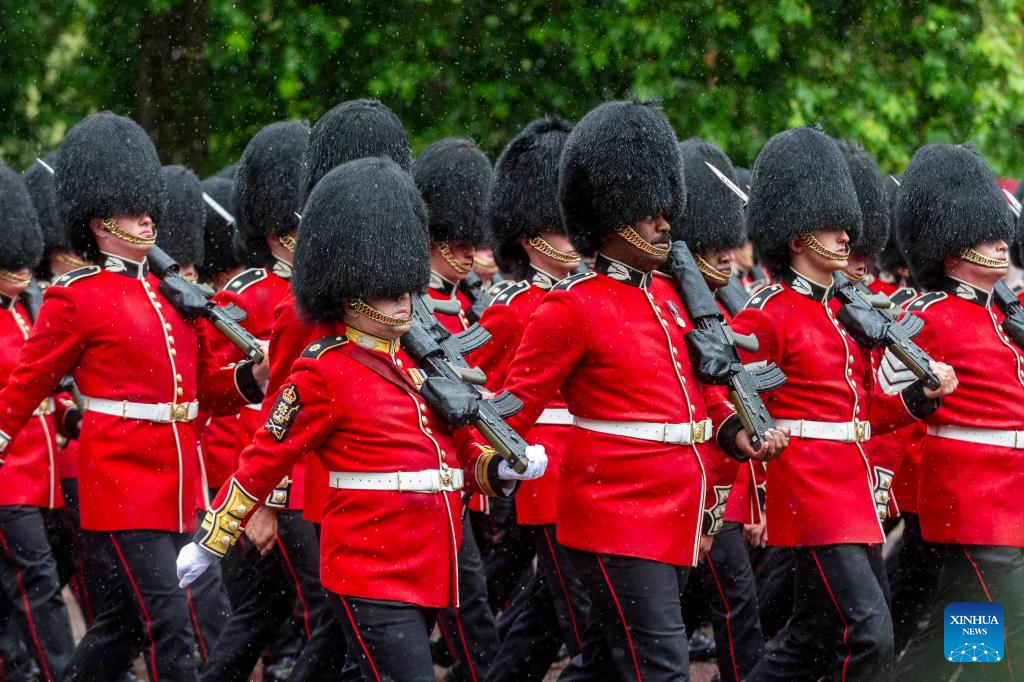 Members of the Household Division march during the Trooping the Colour parade to honour Britain's King Charles III on his official birthday in London, Britain, on June 15, 2024. (Photo by Stephen Chung/Xinhua)