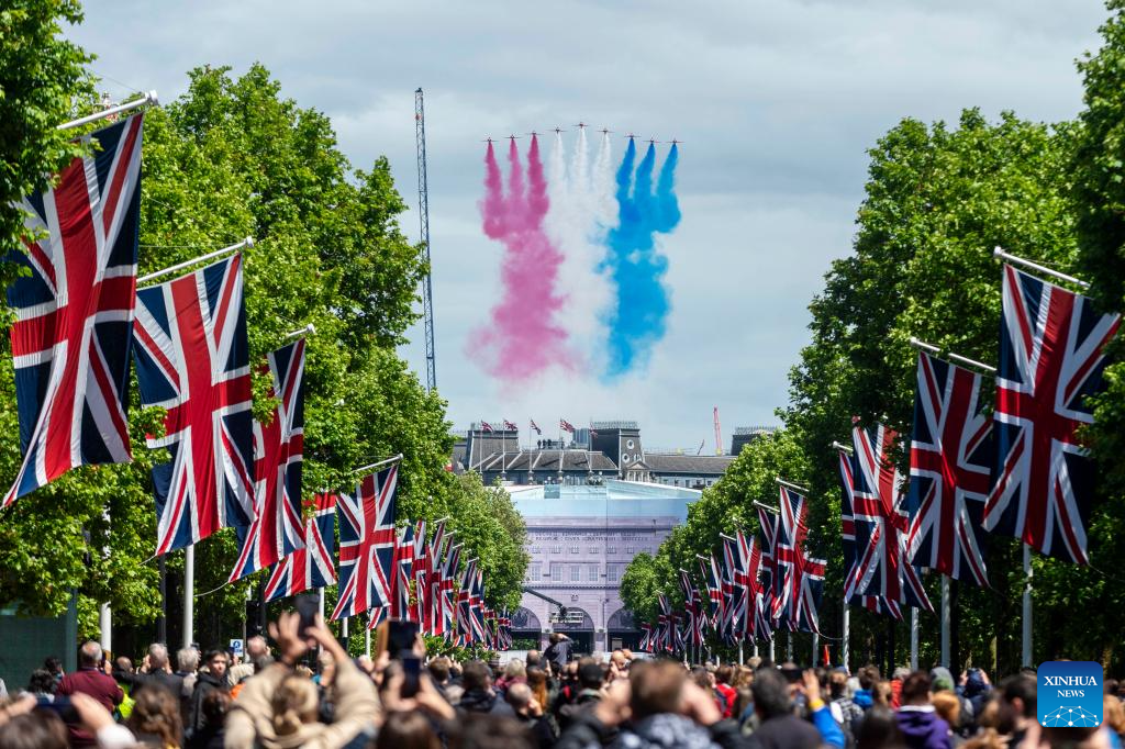 People watch a flypast over the Mall after the Trooping the Colour parade to honour Britain's King Charles III on his official birthday in London, Britain, on June 15, 2024. (Photo by Stephen Chung/Xinhua)