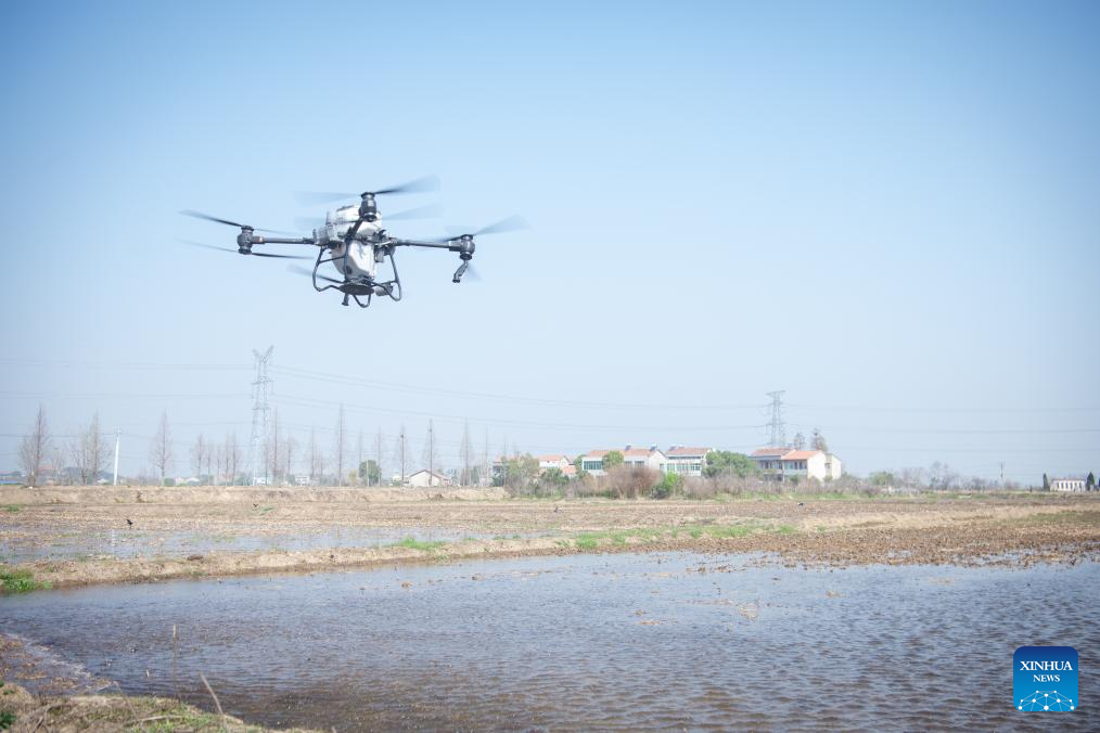 A drone sows seeds at a field in Hugangwan Village of Wuhan, central China's Hubei Province, March 15, 2023. With the application of technologies such as 5G and BeiDou Navigation Satellite System, the intelligent level of traditional industries in China's central region has been upgraded in recent years. (Xinhua/Wu Zhizun)