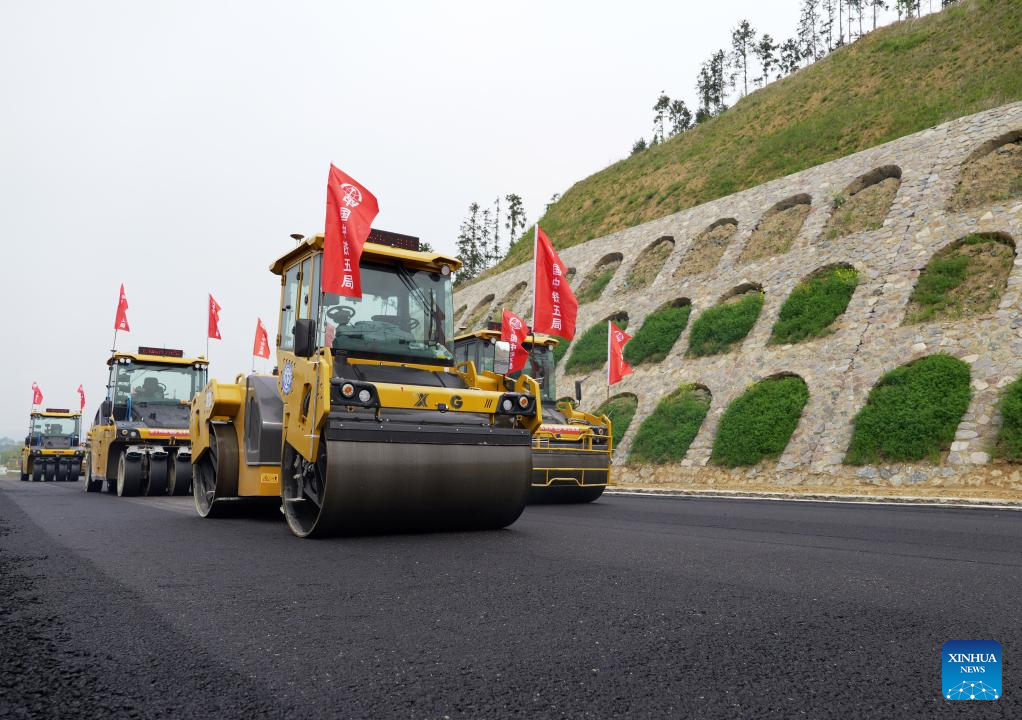 Automated road rollers operate at the construction site of an expressway in Xinxian County, central China's Henan Province, April 11, 2024. With the application of technologies such as 5G and BeiDou Navigation Satellite System, the intelligent level of traditional industries in China's central region has been upgraded in recent years. (Xinhua/Li Jianan)