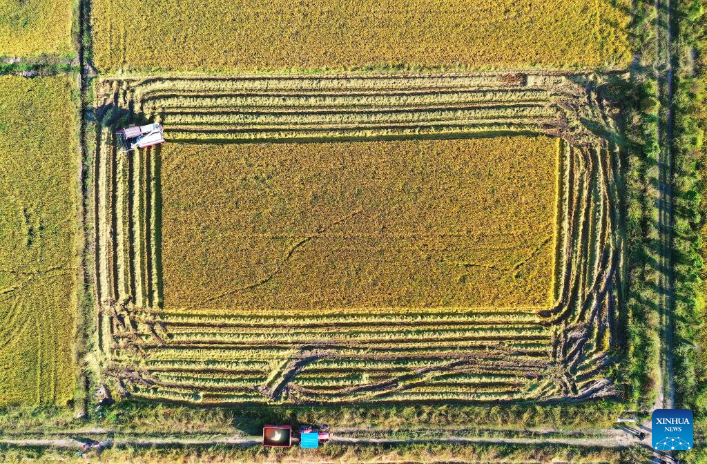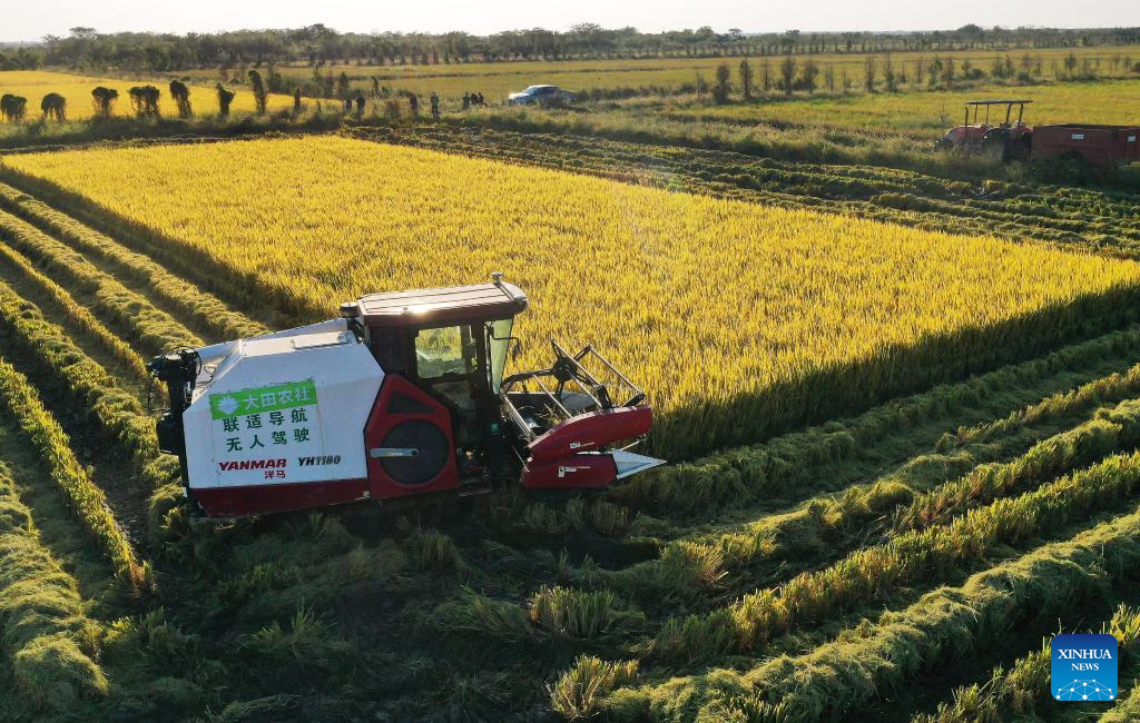 An automated harvester equipped with navigation system works in the rice fields in Nanchang County of China's Jiangxi Province, Oct. 11, 2022. With the application of technologies such as 5G and BeiDou Navigation Satellite System, the intelligent level of traditional industries in China's central region has been upgraded in recent years. (Xinhua/Wan Xiang)