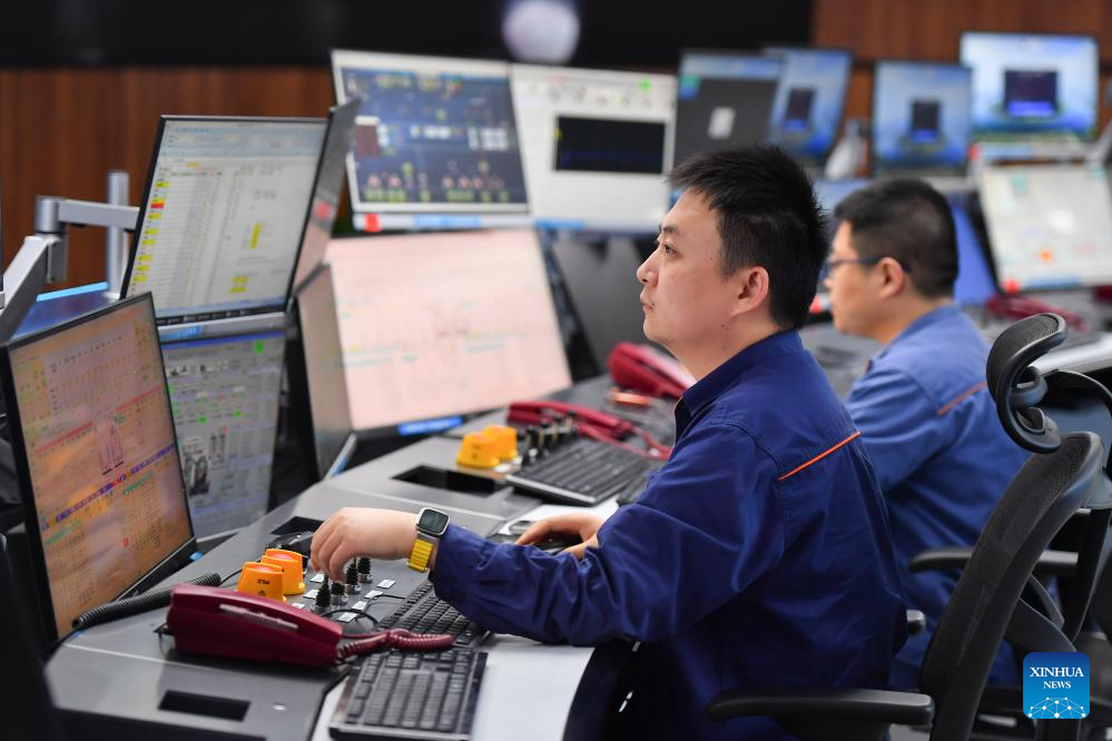 Workers operate heating furnace remotely at an intelligent center of an iron and steel factory in Xiangtan, central China's Hunan Province, June 13, 2024. With the application of technologies such as 5G and BeiDou Navigation Satellite System, the intelligent level of traditional industries in China's central region has been upgraded in recent years. (Xinhua/Chen Zeguo)