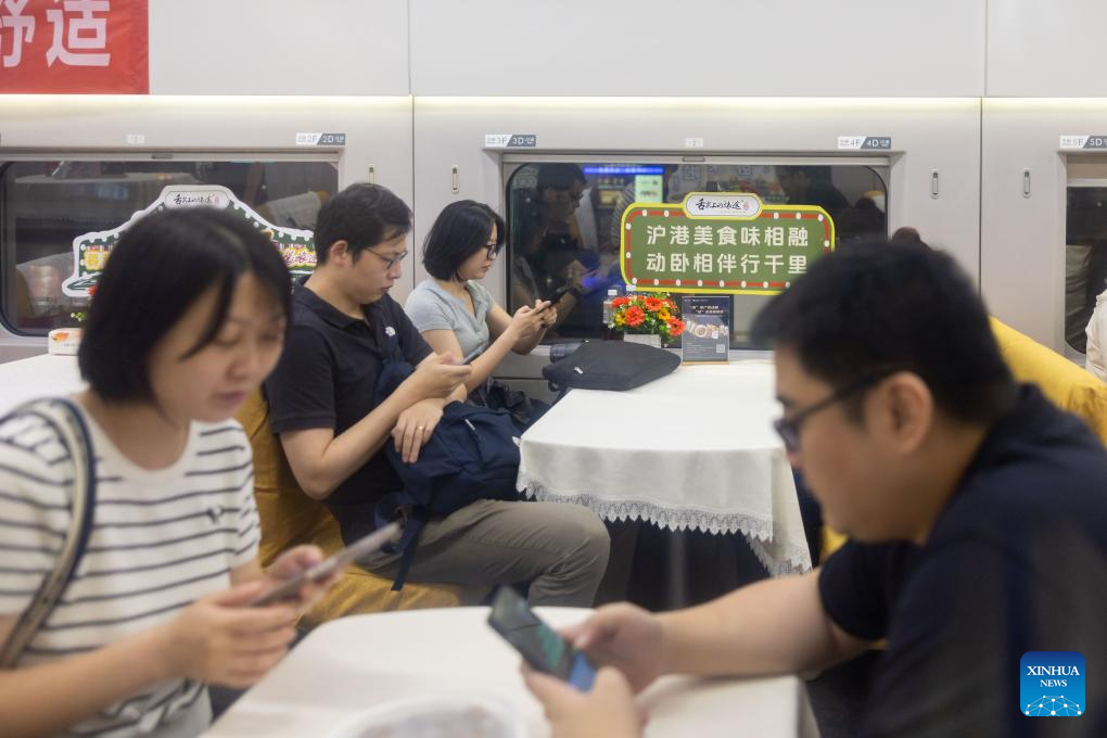 Passengers order food onboard the high-speed sleeper train D910 bound for Beijing West Railway Station, in Hong Kong, south China, June 15, 2024. High-speed sleeper trains linking Beijing and Shanghai with Hong Kong commenced operations on Saturday.