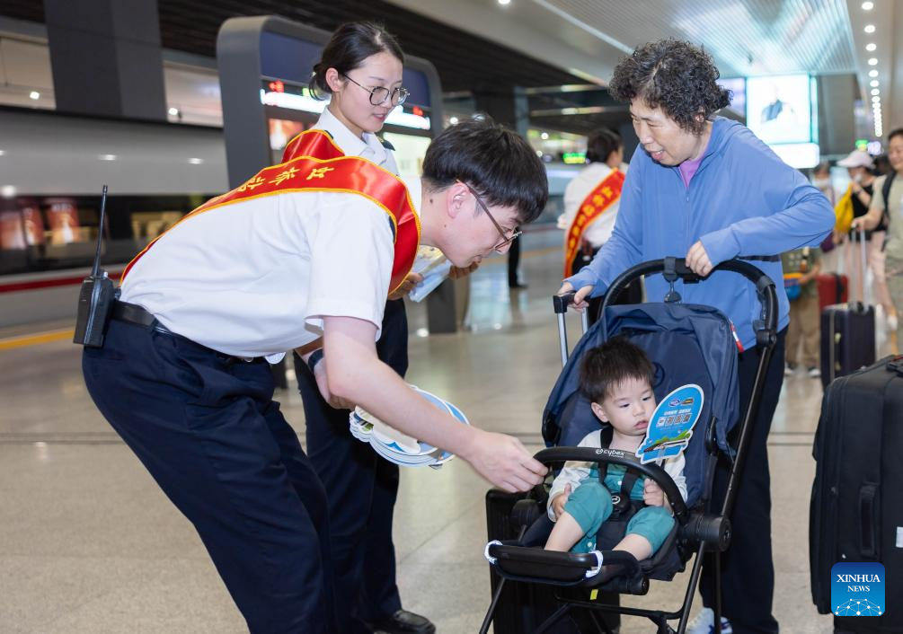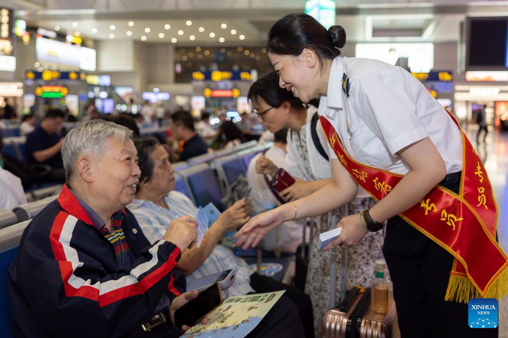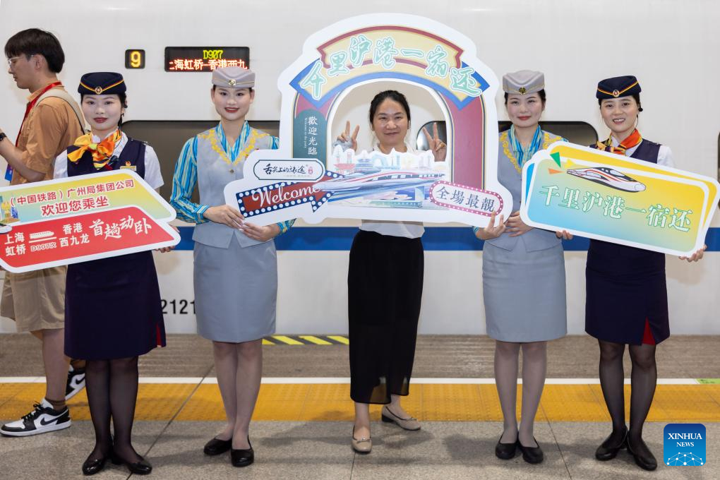 Staff members present gifts to passengers taking the high-speed sleeper train D907 bound for Hong Kong's West Kowloon Station at Shanghai Hongqiao Railway Station in east China's Shanghai, June 15, 2024. High-speed sleeper trains linking Beijing and Shanghai with Hong Kong commenced operations on Saturday.