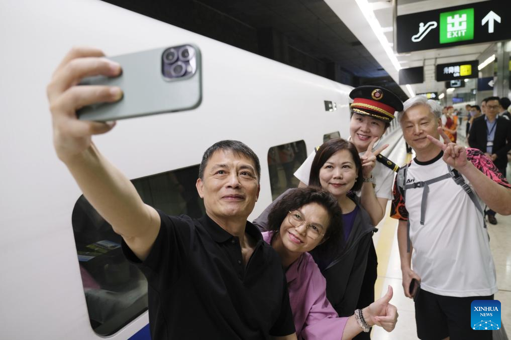 Passengers taking the high-speed sleeper train D910 bound for Beijing West Railway Station pose for a selfie at Hong Kong's West Kowloon Station in Hong Kong, south China, June 15, 2024. High-speed sleeper trains linking Beijing and Shanghai with Hong Kong commenced operations on Saturday.
