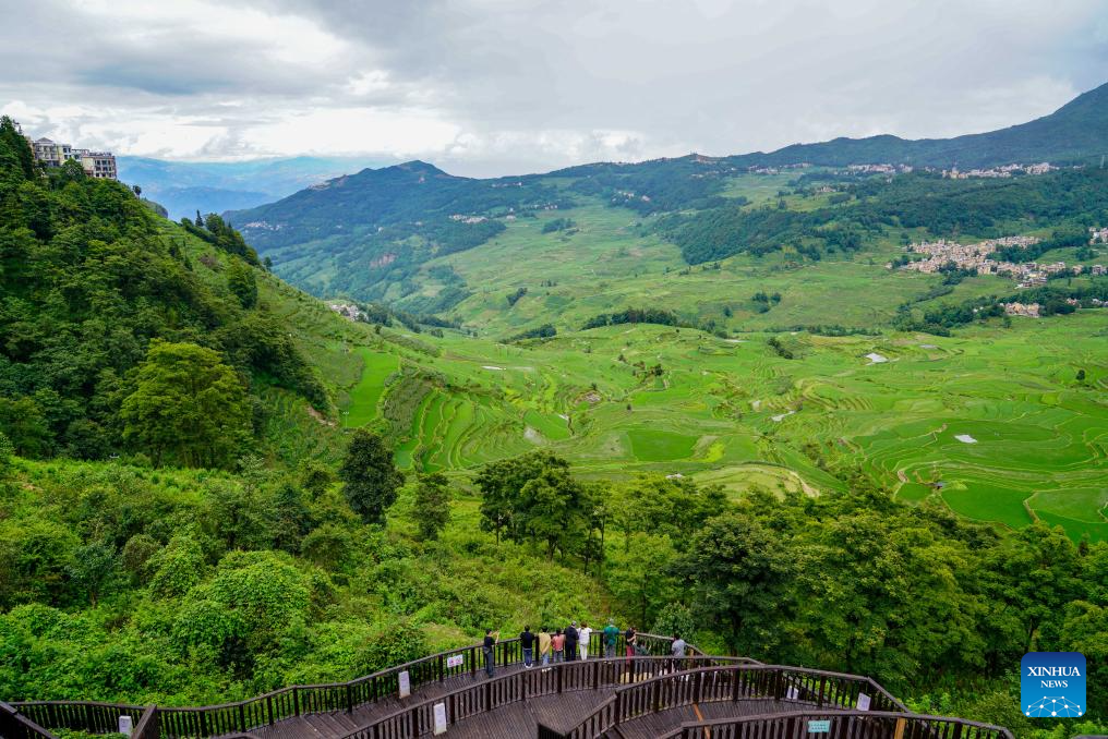 Tourists enjoy the view of Hani terraced fields in Yuanyang County of Honghe Hani and Yi Autonomous Prefecture, southwest China's Yunnan Province, June 14, 2024. (Xinhua/Wang Jingyi)