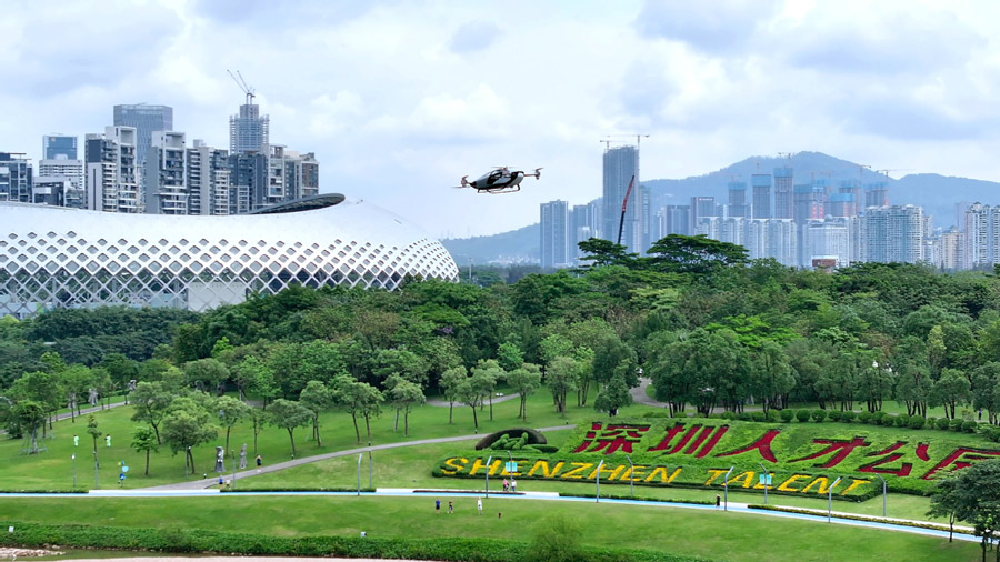 On May 25, XPeng Aeroht, a leading player in the aerial mobility industry, let its flying car, the X2, fly over the Shenzhen central business district in Guangdong province for the first time, giving a sneak peek into the future of urban transportation.