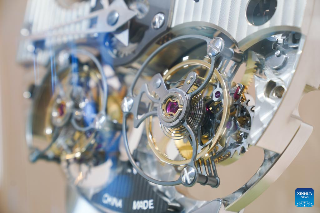 This photo taken on June 18, 2024 shows a watch movement model at Liaoning Peacock Watch Co., Ltd. in Dandong City, northeast China's Liaoning Province. The watch industry is one of the traditional industries in Dandong City. In recent years, Dandong has vigorously promoted technological innovation and cultivated innovative enterprises, so as to upgrade traditional industries and develop high-tech manufacturing. (Xinhua/Fan Yuqing)
