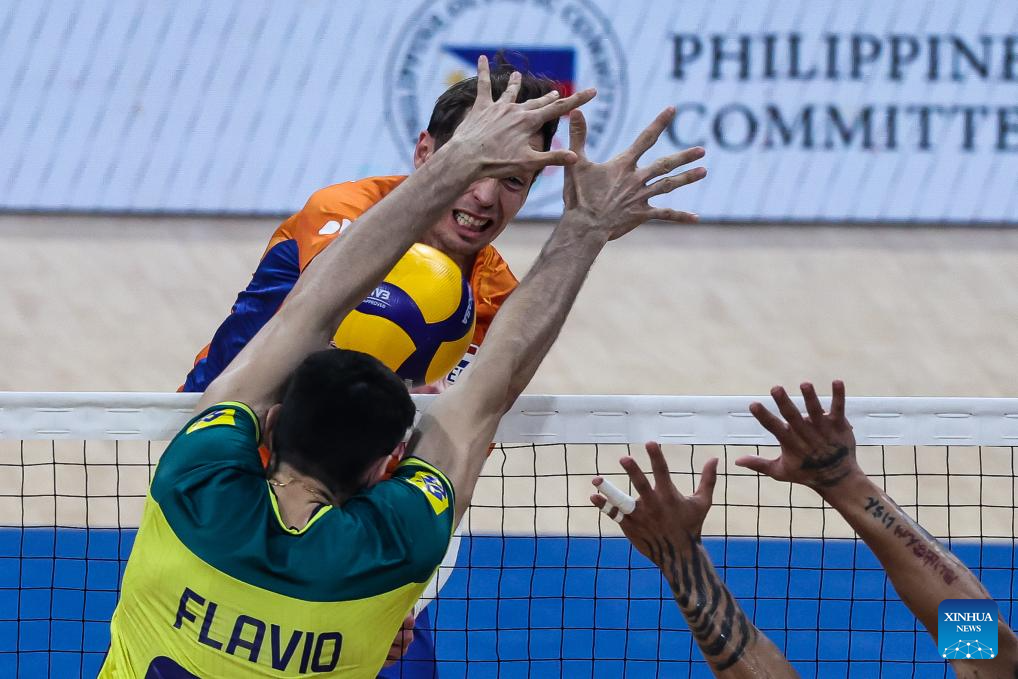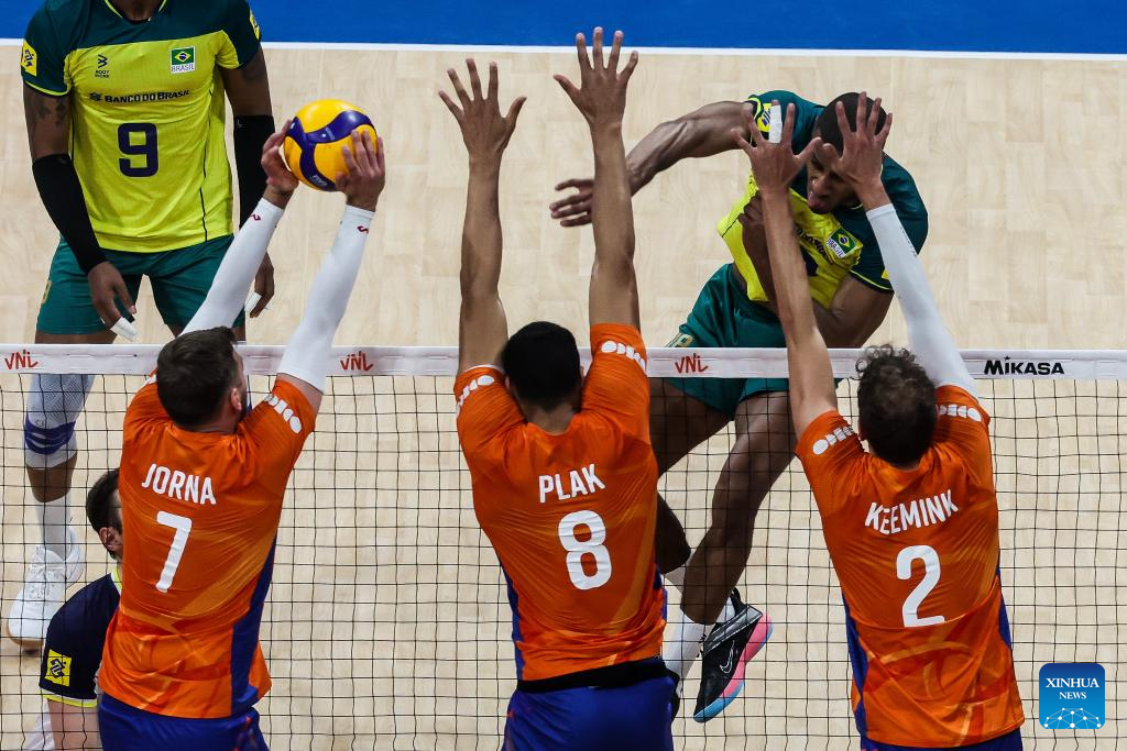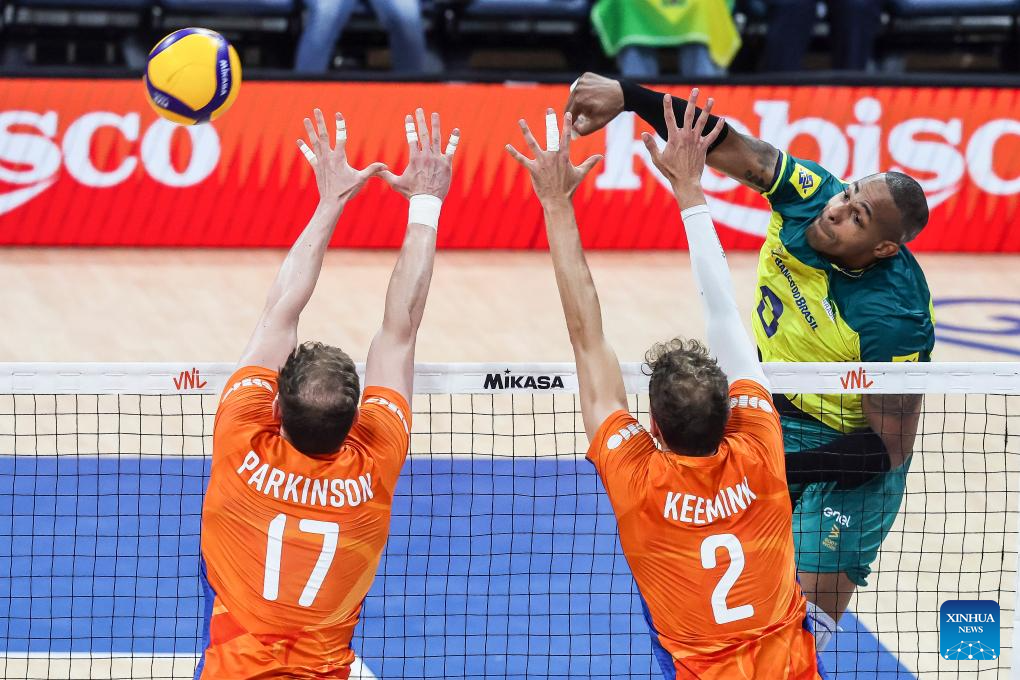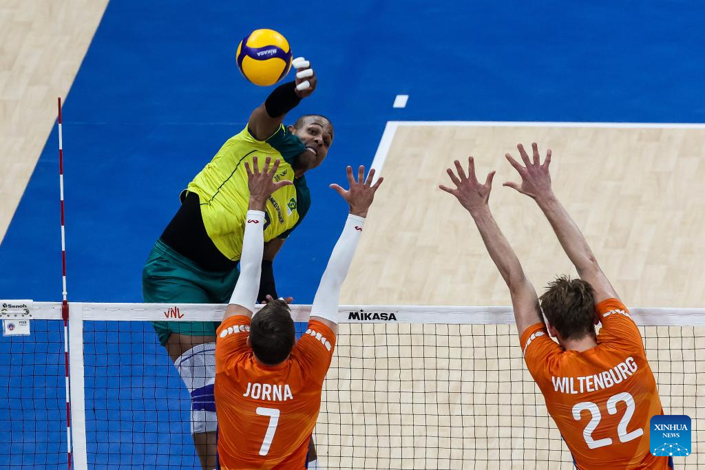 Ricardo Lucarelli Souza (top R) of Brazil spikes the ball during the match between Brazil and the Netherlands at the Men's Volleyball Nations League (VNL) 2024 in Pasay City, the Philippines, on June 18, 2024. (Xinhua/Rouelle Umali)