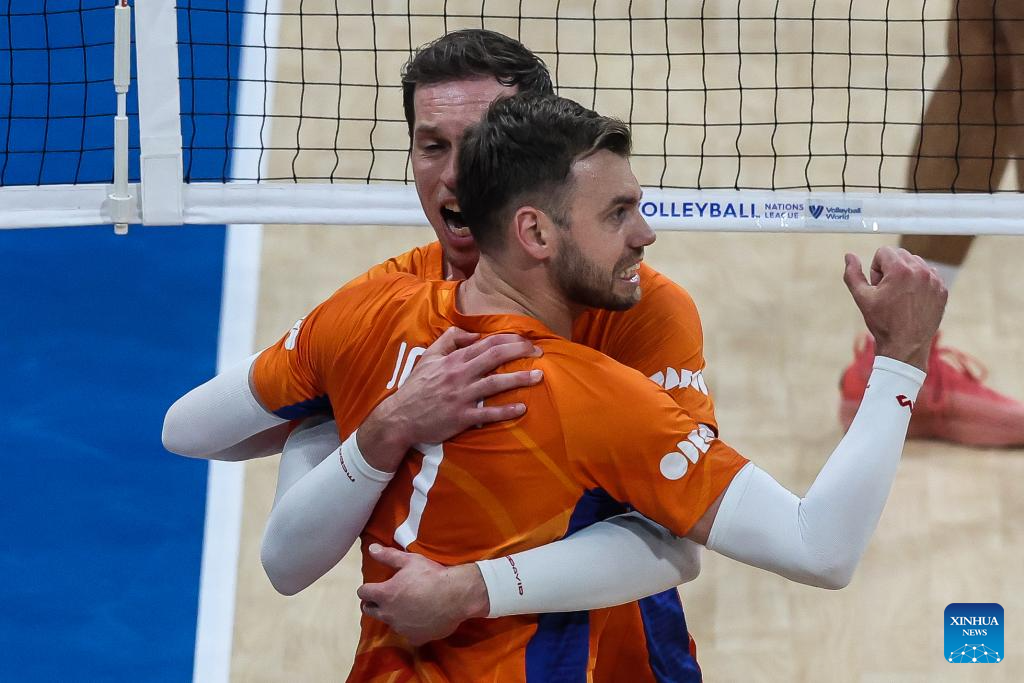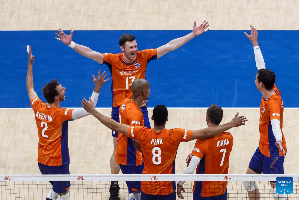Players of the Netherlands celebrate after scoring during the match between Brazil and the Netherlands at the Men's Volleyball Nations League (VNL) 2024 in Pasay City, the Philippines, on June 18, 2024. (Xinhua/Rouelle Umali)