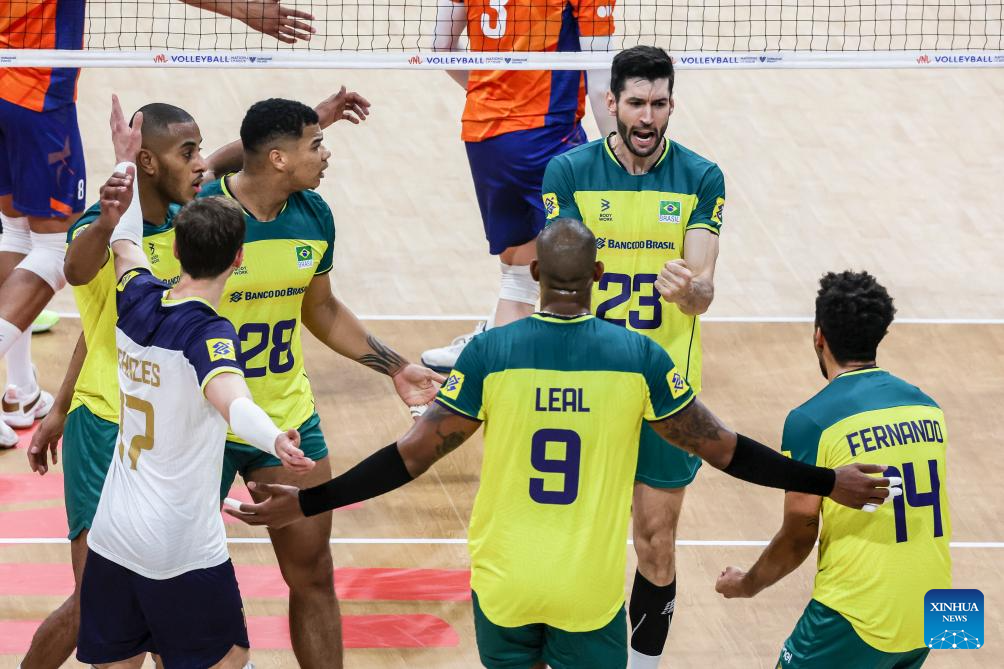 Players of Brazil celebrate after scoring during the match between Brazil and the Netherlands at the Men's Volleyball Nations League (VNL) 2024 in Pasay City, the Philippines, on June 18, 2024. (Xinhua/Rouelle Umali)