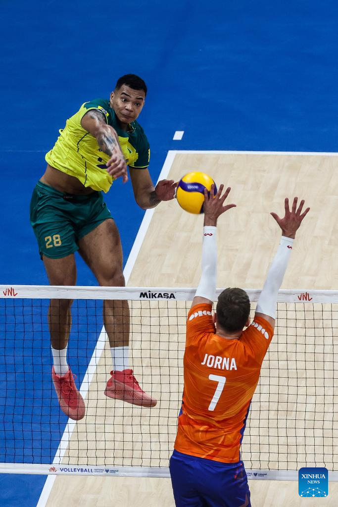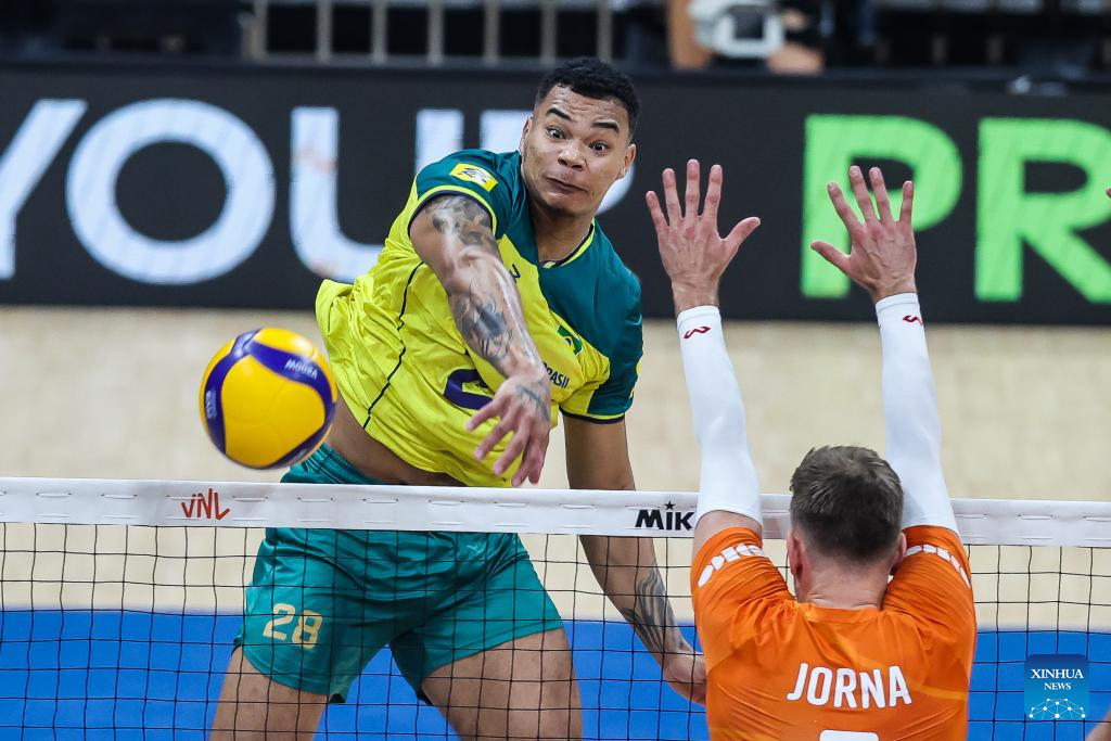 Yoandy Leal Hidalgo (R) of Brazil spikes the ball during the match between Brazil and the Netherlands at the Men's Volleyball Nations League (VNL) 2024 in Pasay City, the Philippines, on June 18, 2024. (Xinhua/Rouelle Umali)