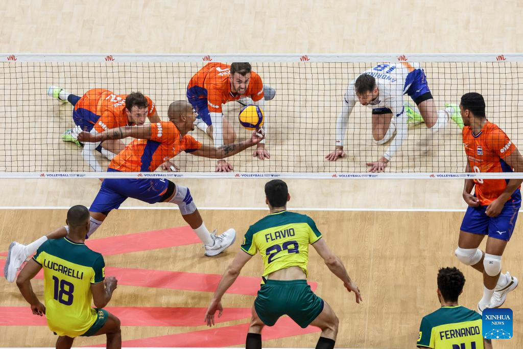 Nimir Abdel-Aziz (3rd L) of the Netherlands tries to return the ball during the match between Brazil and the Netherlands at the Men's Volleyball Nations League (VNL) 2024 in Pasay City, the Philippines, on June 18, 2024. (Xinhua/Rouelle Umali)