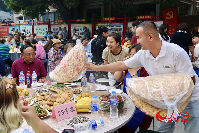 Residents of different ethnic groups share homemade food at an annual grand feast named "hundred family feast" in the Guyuanxiang community in Tianshan district, Urumqi, capital of northwest China's Xinjiang Uygur Autonomous Region, to celebrate the Corban Festival, one of the major festivals of Muslims in China, on June 17, 2024. (People's Daily Online/Li Long)