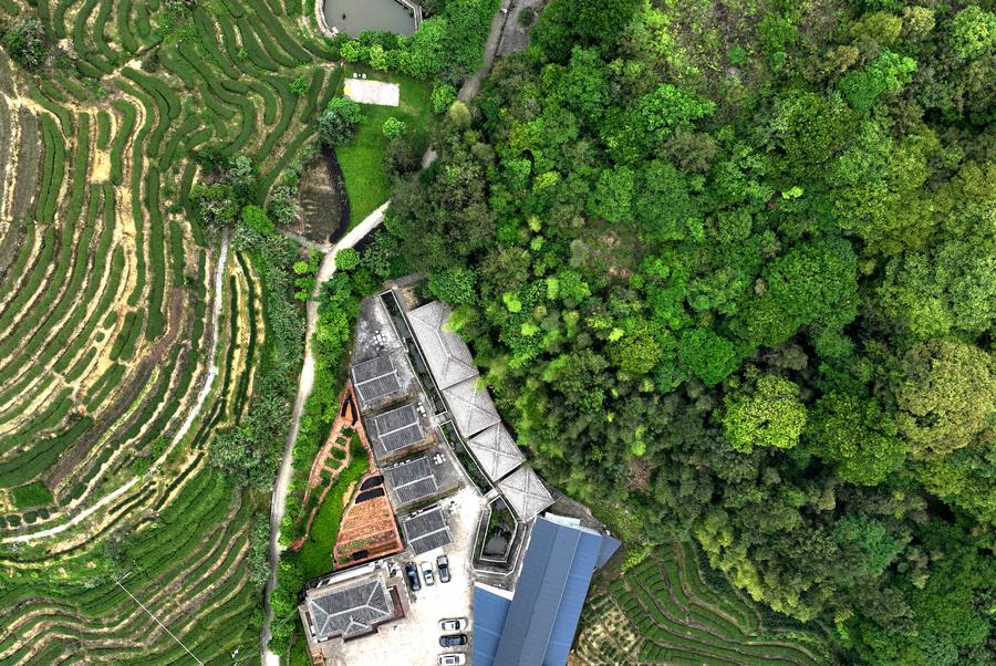 An aerial drone photo taken on May 9, 2024 shows a tea farm in Xiping Town of Anxi County, Quanzhou City, China's Fujian Province. (Xinhua/Wei Peiquan)