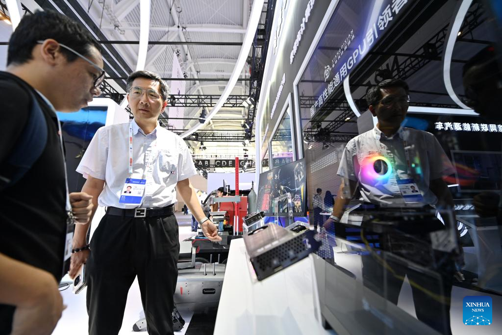 People visit the booth of China-made graphics processing units (GPU) at the World Intelligence Expo 2024 in north China's Tianjin, June 20, 2024.