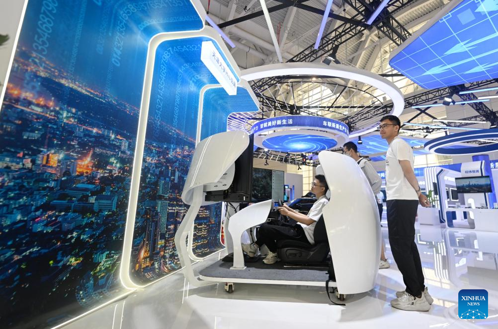 A visitor tries simulation driving at the World Intelligence Expo 2024 in north China's Tianjin, June 20, 2024.