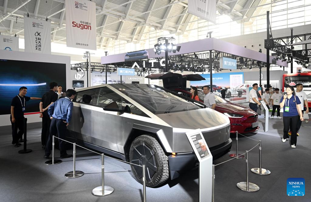 People view a Tesla vehicle at the World Intelligence Expo 2024 in north China's Tianjin, June 20, 2024.