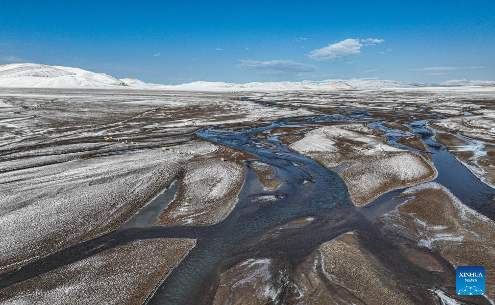 An aerial drone photo taken on June 15, 2024 shows a view of the Tianshui River in the Qiangtang National Nature Reserve in southwest China's Xizang Autonomous Region. Tianshui River is an important migratory passage for pregnant Tibetan antelopes in the Qiangtang National Nature Reserve. (Xinhua/Jigme Dorje)
