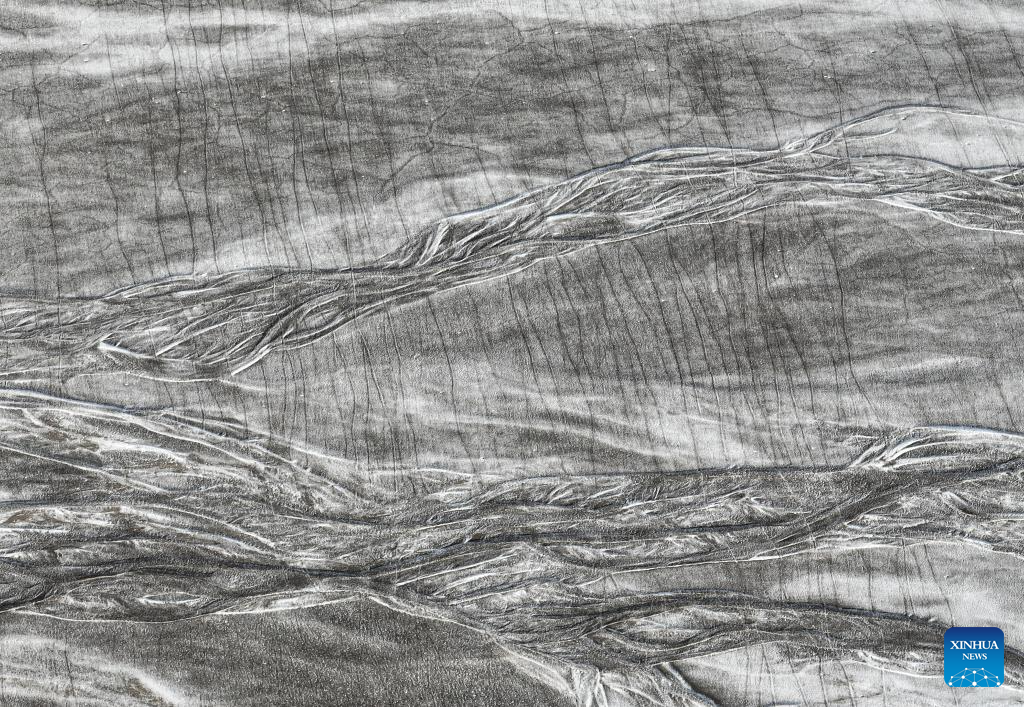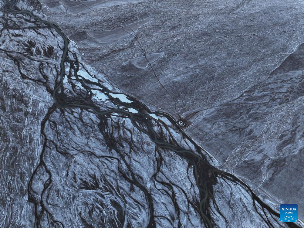 An aerial drone photo taken on June 15, 2024 shows trails left by Tibetan antelopes on the riverbed of the Tianshui River in the Qiangtang National Nature Reserve in southwest China's Xizang Autonomous Region. Tianshui River is an important migratory passage for pregnant Tibetan antelopes in the Qiangtang National Nature Reserve. (Xinhua/Jigme Dorje)