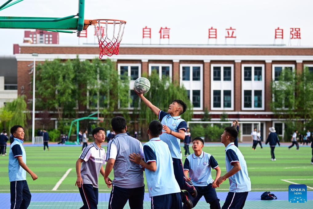 Students play basketball at the Golog-Xining Ethnic High School, which has a paired assistance relationship with Shanghai, in Xining City, northwest China's Qinghai Province, June 18, 2024. (Xinhua/Zhang Long)