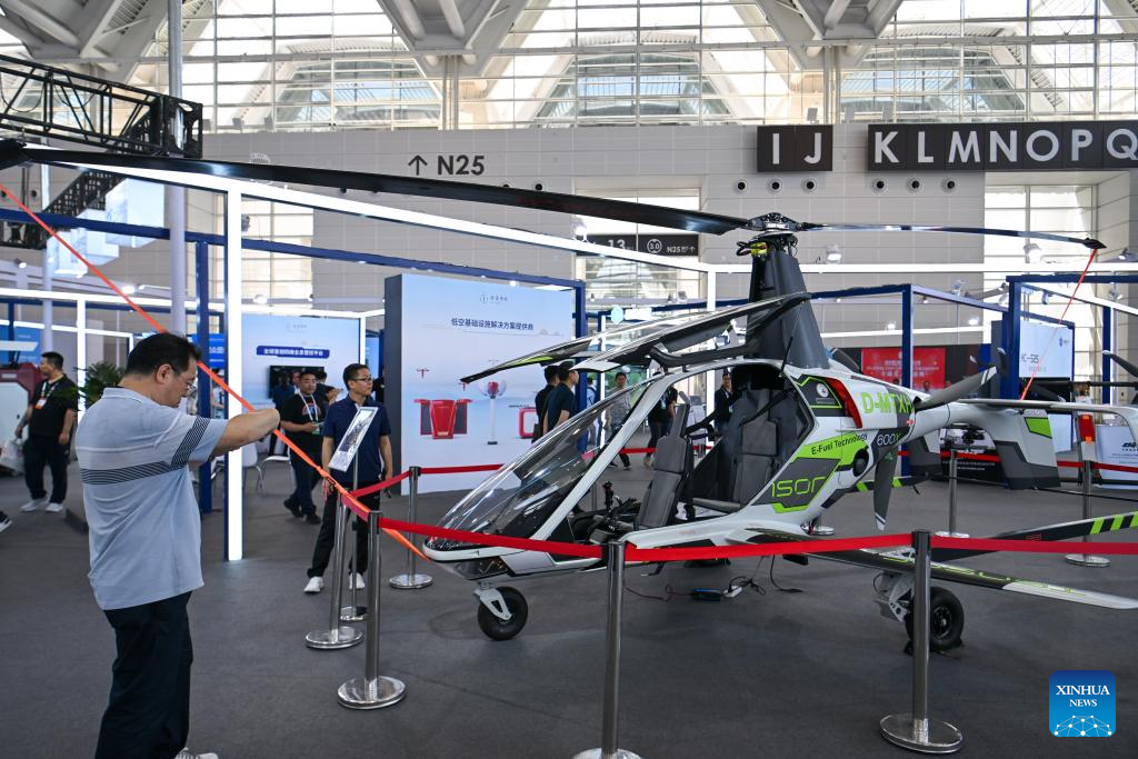 A low-altitude aircraft is seen at National Convention and Exhibition Center in north China's Tianjin, June 19, 2024. The World Intelligence Expo 2024, with the theme of "Intelligence: Extensive Development Space, Sustainable Growth Driver," opened on Thursday in north China's Tianjin, and exhibition of low-altitude economy has won much attention.