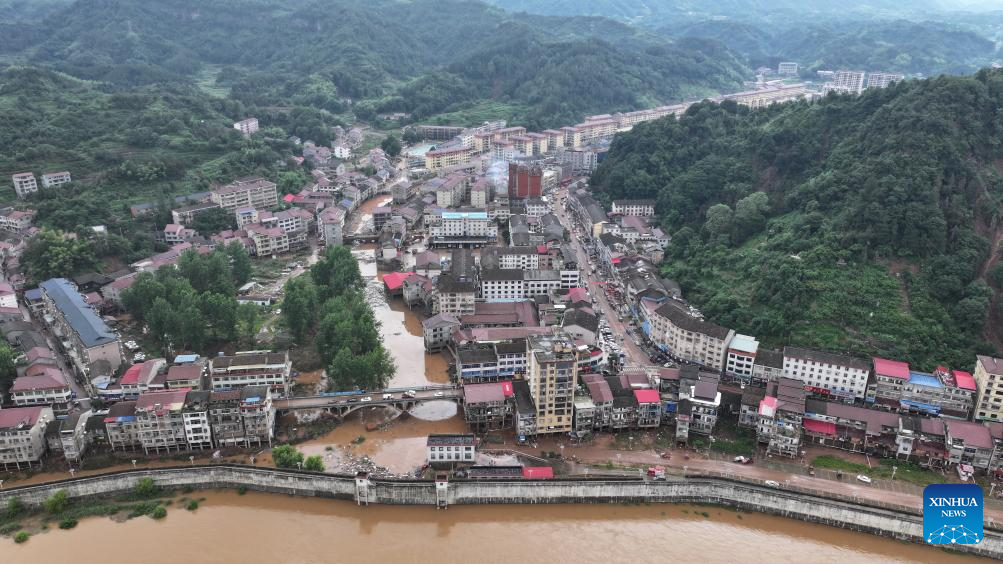An aerial drone photo taken on June 23, 2024 shows Wuqiangxi Township of Yuanling County in central China's Hunan Province. Heavy rainfall hit Wuqiangxi Township on Saturday, triggering flood that impacted local residential area. Local authorities have carried out emergency response to minimize the impact of the extreme weather conditions. (Photo by Wang Sheng/Xinhua)