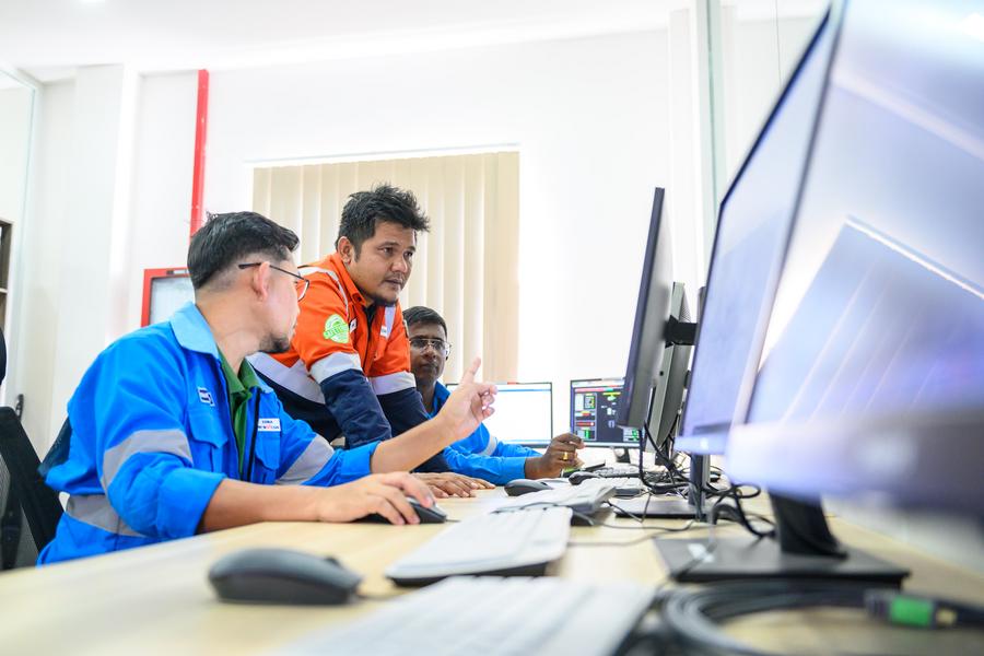 Staff member Mohd Suffian (C) works at the photovoltaic power station in Kuala Ketil, Malaysia, June 6, 2024. (Photo by Chong Voon Chung/Xinhua)