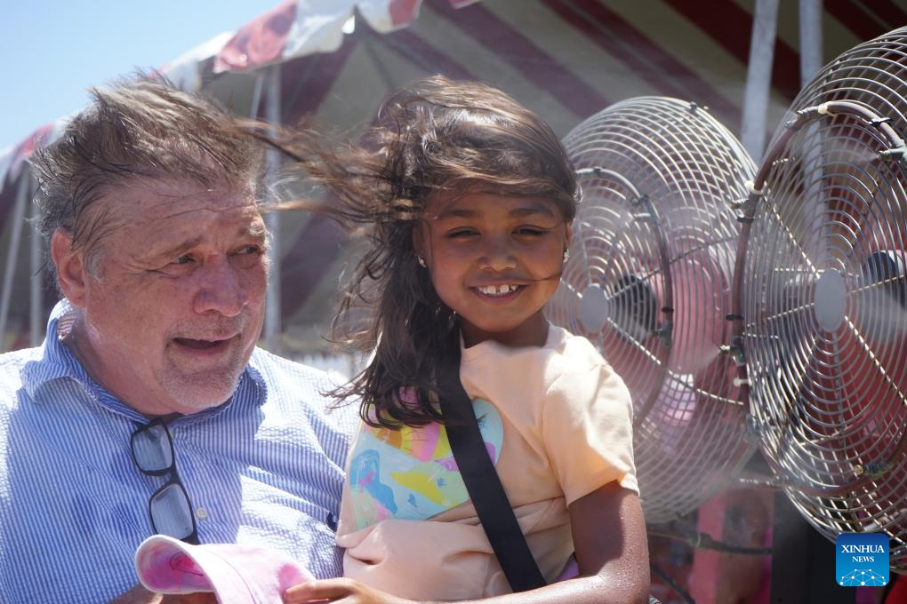 People cool off by the fans in Orange County, California, the United States, on June 22, 2024. An intensive heat wave continued to grip much of the United States this weekend, triggering record-breaking temperatures and placing millions of people under heat alerts. (Xinhua)