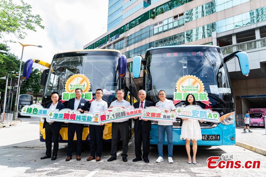 An inauguration ceremony for the operation of the first cross-border electric tourist coach between Hong Kong Special Administrative Region and Shenzhen City in Guangdong Province is held at a cross-boundary coach terminal in Sheung Shui, Hong Kong on June 24. (Photo: China News Service/Hou Yu)