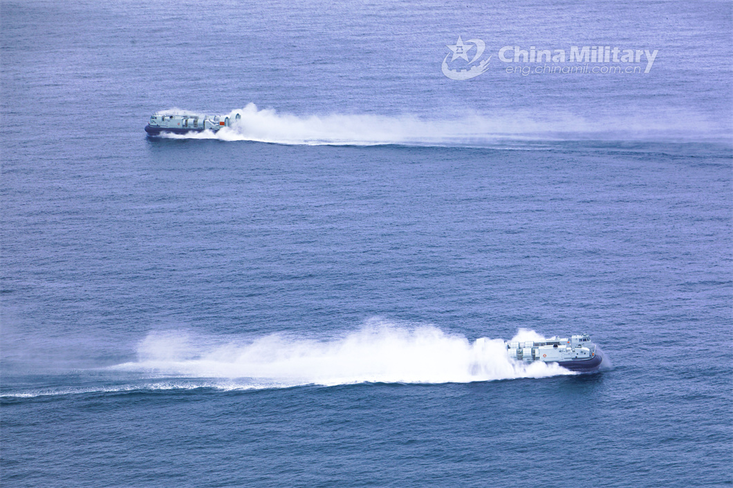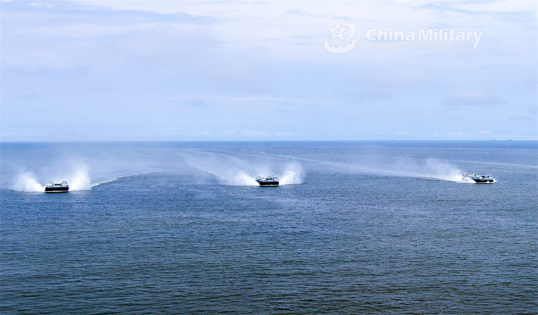 Air-cushioned landing craft attached to a ship group under the PLA Navy travel in formation on the sea during a multi-subject training exercise on June 4, 2024. (eng.chinamil.com.cn/Photo by Ze Tianyu)
