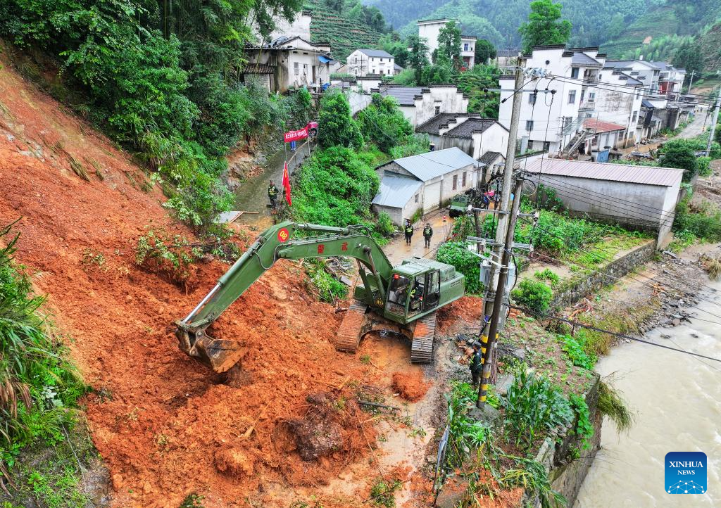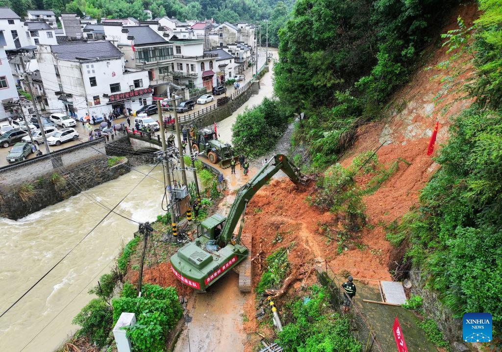 A member of armed police force operates an excavator to restore a blocked road in Qingxi Village, Shexian County, Huangshan City, east China's Anhui Province. Rare and heavy rainfall has hit Huangshan recently, triggering flood situations in the city. Local emergency response authorities have been promptly deploying manpower and resources, draining floodwater, cleaning up muds and relocating affected residents. (Xinhua/Du Yu)