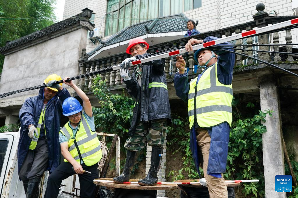Support workers of a mobile telecom service carrier try to restore damaged optical fiber cables at Shengzhuang Village of Shexian County, Huangshan City, east China's Anhui Province, June 24, 2024. Rare and heavy rainfall has hit Huangshan recently, triggering flood situations in the city. Local emergency response authorities have been promptly deploying manpower and resources, draining floodwater, cleaning up muds and relocating affected residents. (Xinhua/Du Yu)