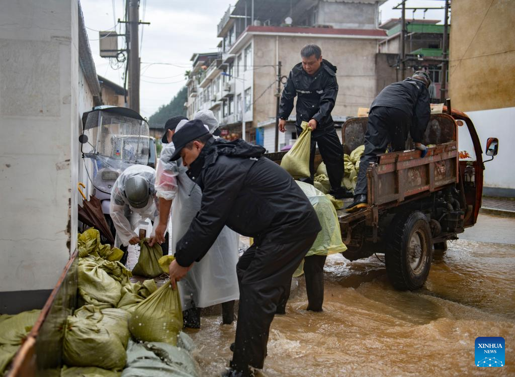 Emergency response workers place sandbags at a local community in Tunxi District of Huangshan City, east China's Anhui Province, June 24, 2024. Rare and heavy rainfall has hit Huangshan recently, triggering flood situations in the city. Local emergency response authorities have been promptly deploying manpower and resources, draining floodwater, cleaning up muds and relocating affected residents. (Xinhua/Fu Tian)