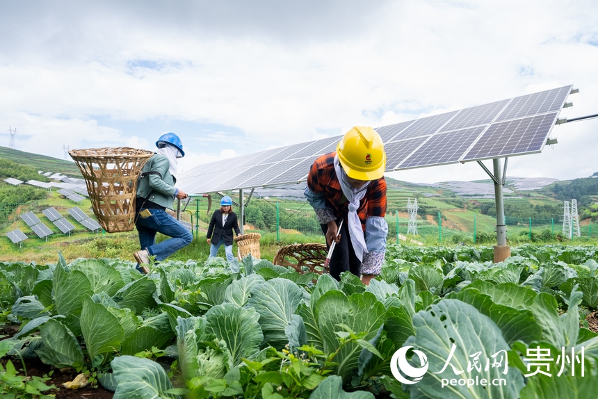 Villagers harvest vegetables planted under photovoltaic panels in the Xianshuiwo agricultural photovoltaic power station in Weining Yi, Hui and Miao Autonomous County, Bijie, southwest China’s Guizhou Province. (People’s Daily Online/Tu Min)